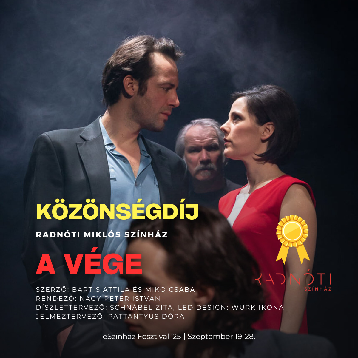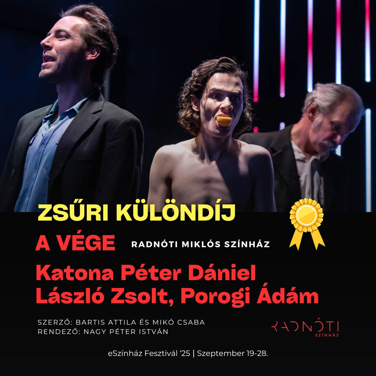 - az első különdíjjal a szakmai zsűri a Szabad Andrást alakító három színművészt jutalmazta, azaz László Zsoltot, Porogi Ádámot és Katona Péter Dánielt a Radnóti Miklós Színház: A vége című előadásban nyújtott kimagasló játékukért,