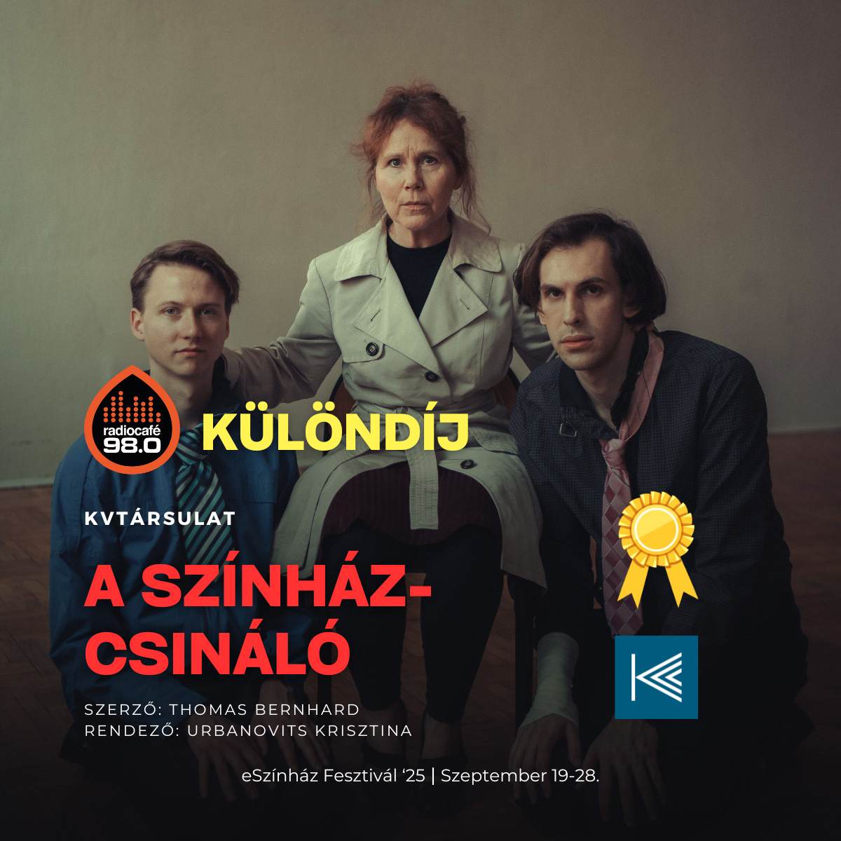 Az eredményhirdetést követően november 7-én ünnepélyes keretek között kerülnek kiosztásra az eSzínház Fesztivál ’25 szakmai-, közönség- és különdíjai a Jurányi Házban. Az eseményen a laudációk mellett az elismerésekkel járó díjak és felajánlások is átadásra kerülnek.